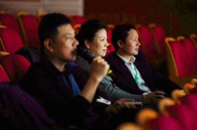 开演前。昆山当代昆剧院总经理张克明(右)、艺术总监龚隐雷(中)、艺术指导钱振荣(左)对舞台上的青年演员充满期待